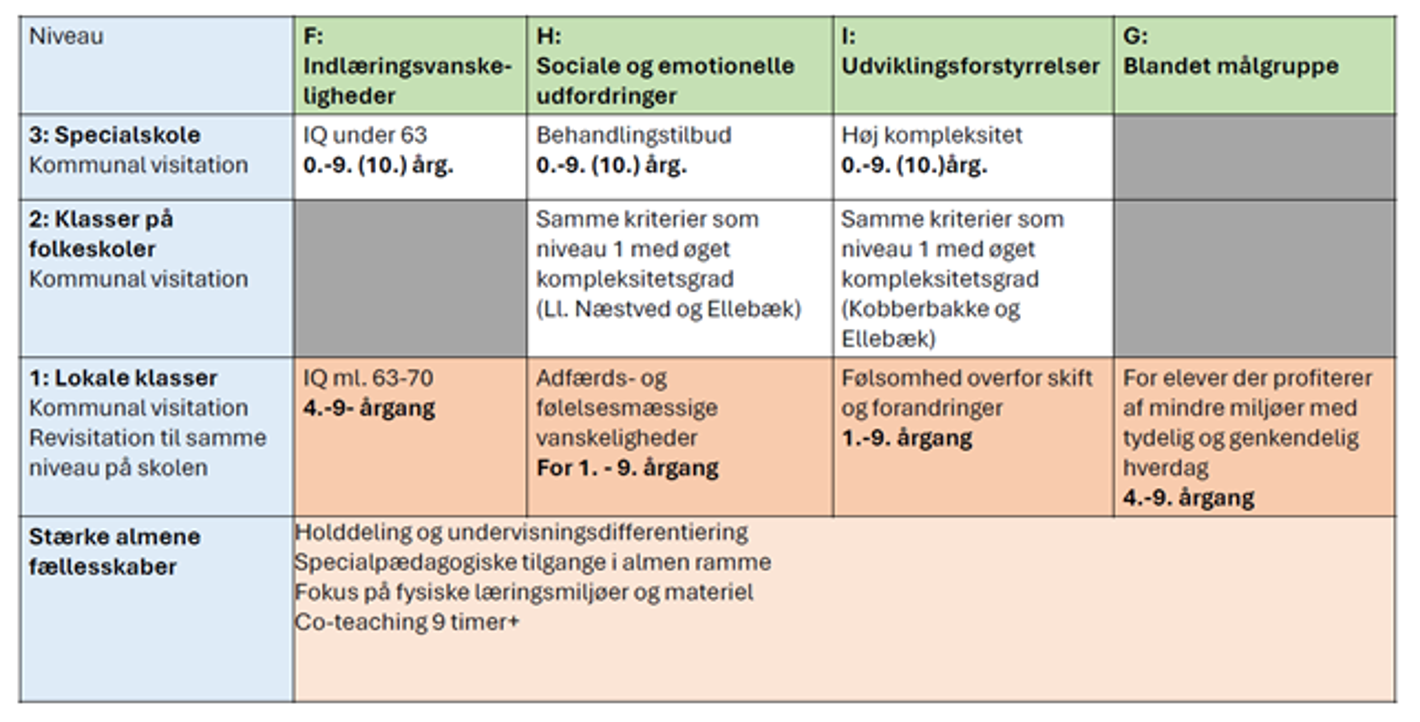 Næstved Kommune har opdelt specialundervisningen i tre niveauer, som er mere specialiseret end støtten, der er mulig via stærke almene fællesskaber. Specialundervisningen er delt i forskellige spor alt efter behov og adfærd. Det kræver en visitation at komme ind i et specialundervisningstilbud, mens støtte fra de stærke almene fællesskaber er mere fleksibel og kan styres af den enkelte skoleledelse.